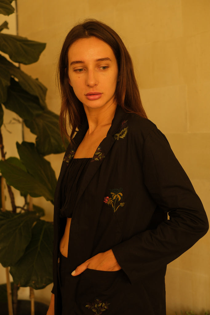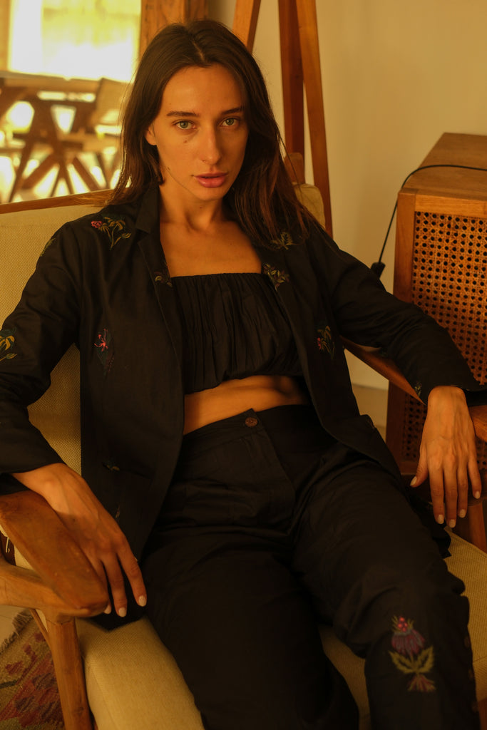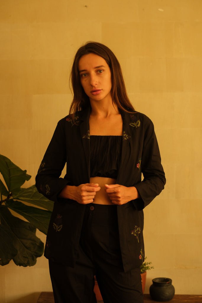 Introducing our Forest Blazer, the perfect addition to your wardrobe for work, family gatherings, and festive dinners! This stylish black blazer features beautiful embroidered motifs that elevate a classic design. With a tailored fit, it keeps you looking sharp and polished, whether you’re at the office or celebrating with loved ones. Pair it effortlessly with our Forest Pants and a chic bustier for a unique and sophisticated look. This versatile blazer is all about combining comfort and style, making it ideal for any occasion. Forest Blazer makes fashion meet functionality.