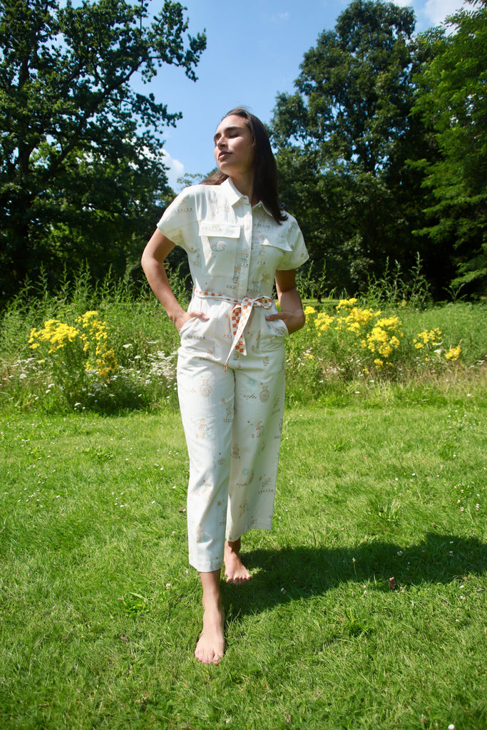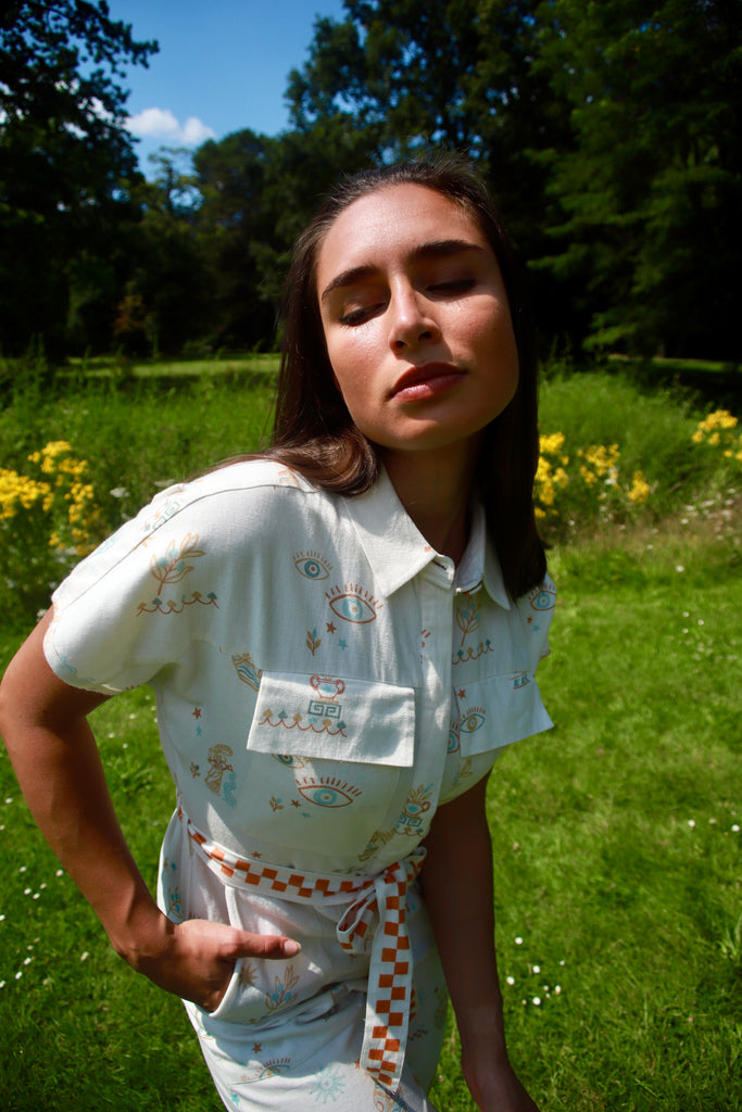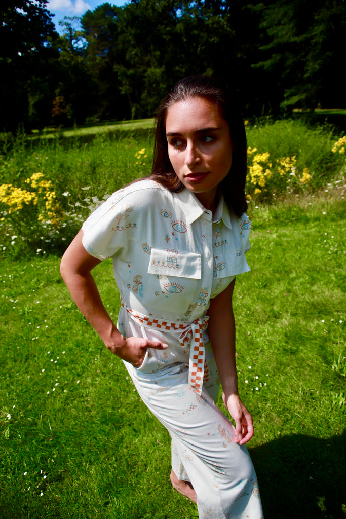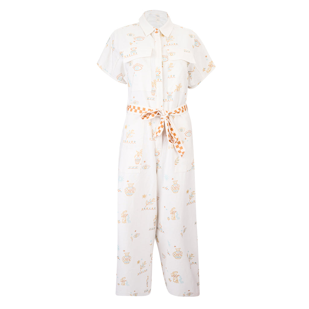 Inspired by sun-drenched Greek summers, this jumpsuit in our Villa Greco print features hand-drawn motifs in cool turquoise and warm rust — a nod to ancient architecture, coastal ceramics, and slow island days. The relaxed silhouette is a straight cut jumpsuit fastened with buttons. It comes with a soft, checked belt, adding playful contrast and subtle structure. Lightweight, breathable, and thoughtfully detailed, it’s the kind of piece that travels effortlessly — from seaside towns to city afternoons.