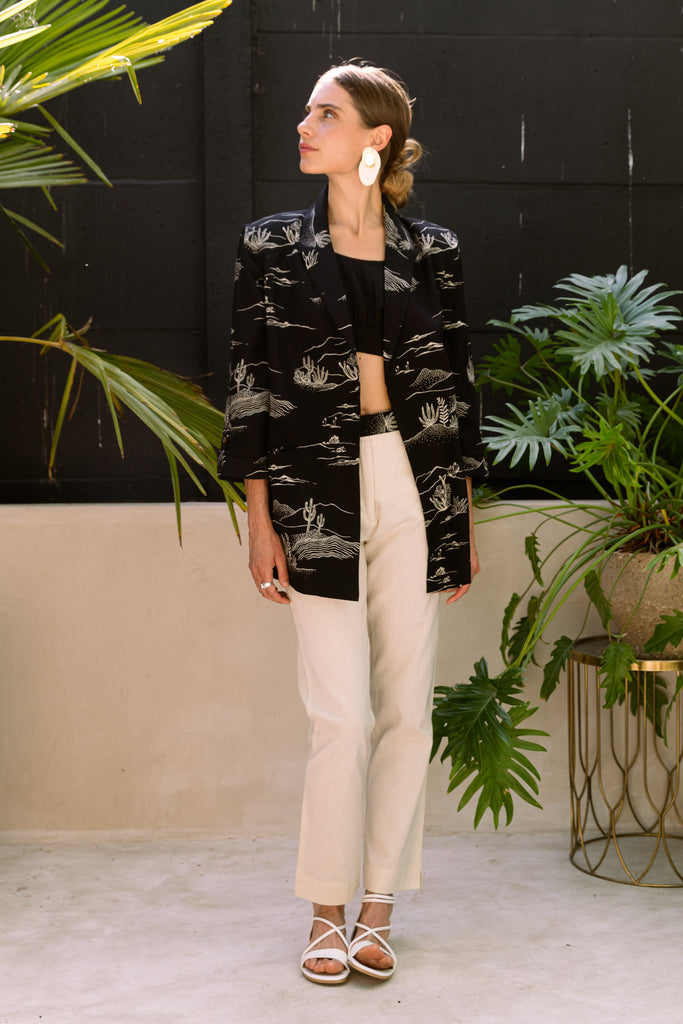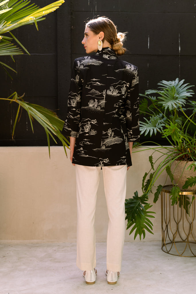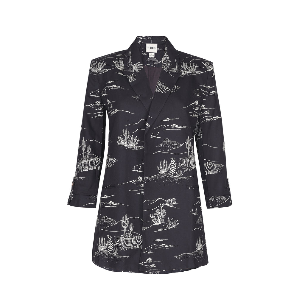 Introducing our versatile black blazer, designed to seamlessly transition from work to holiday. Adorned with an eye-catching Arizona print, this blazer combines bold style with a touch of adventure. The black base color allows the print to stand out, making it perfect for any occasion.Crafted from high-quality, lightweight fabric, this blazer is both comfortable and breathable, making it ideal for those warmer days. The tailored fit and flattering cut create a sleek and sophisticated look that's perfect for the office or a night out on the town. The print is perfect for adding a touch of personality and character to your outfit.With its versatile design and stunning Arizona print, this blazer is perfect for any occasion. Pair it with a blouse and trousers for a polished office look, or dress it down with jeans and a t-shirt for a casual weekend outfit. Pack it in your suitcase for your next holiday, where it can easily transition from daytime adventures to dinner and drinks.Don't miss out on this must-have piece for your wardrobe.