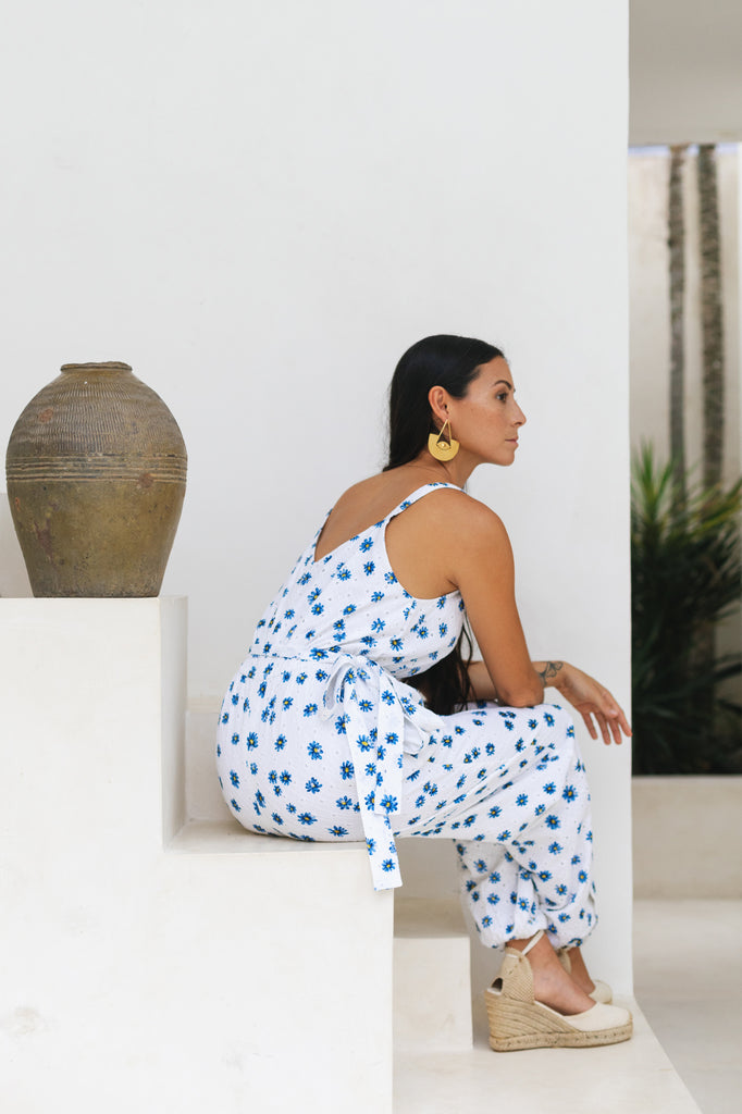 Printed with blue daisies on embroidered cotton, this is a dressy yet easy wear piece. It comes lined with The straps are broad, the neck line is a simple V with slight embroidery detail on it. It comes with a detachable belt. It has coconut button fastening at the ankle, if you'd like to style it differently