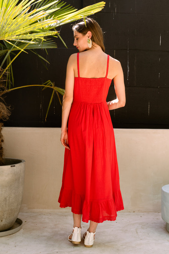 This Vintage style dress brings back the romance of a bygone era. The patch of soft coloured embroidery, the noodle straps and frill at the bottom bring a lot of value to this piece. Pairs well with sandals or flats