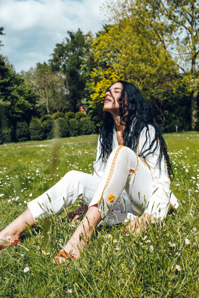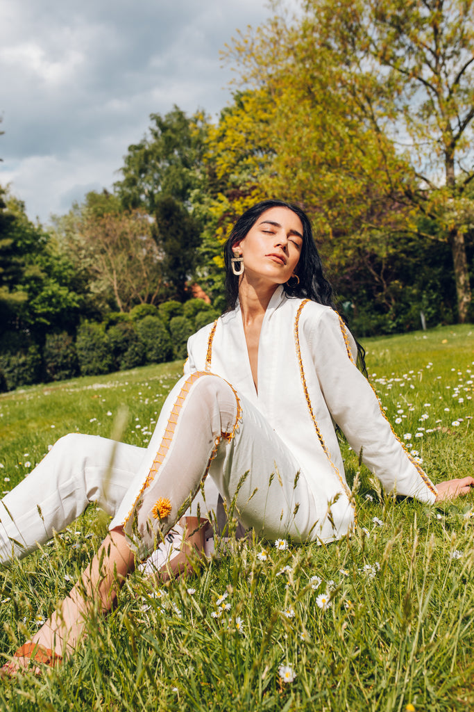 Marigold Blazer & Pants is made in linen, the detail on the blazer is put together with stitches by hand in a yellow thread. The pants have an insert in chanderi, with a hand made marigold flower sewn on it. This outfit can be styled as separates, or be work together.