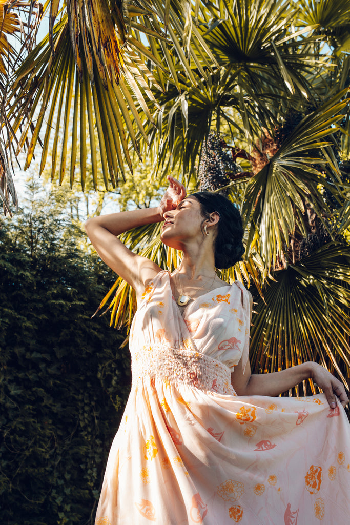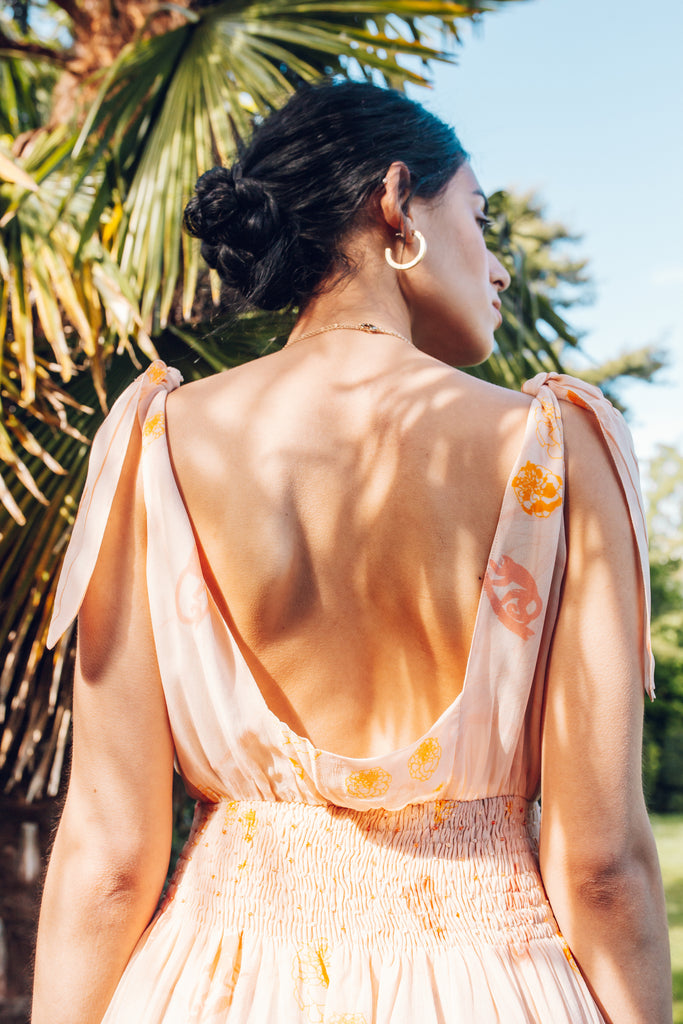 Monkeys & Marigolds tie up dress has a hand smocked belt, which is embellished with beads. The square back and the tie ups on shoulder make for a beautiful detail. Ideal for lazy days & sunday brunches.