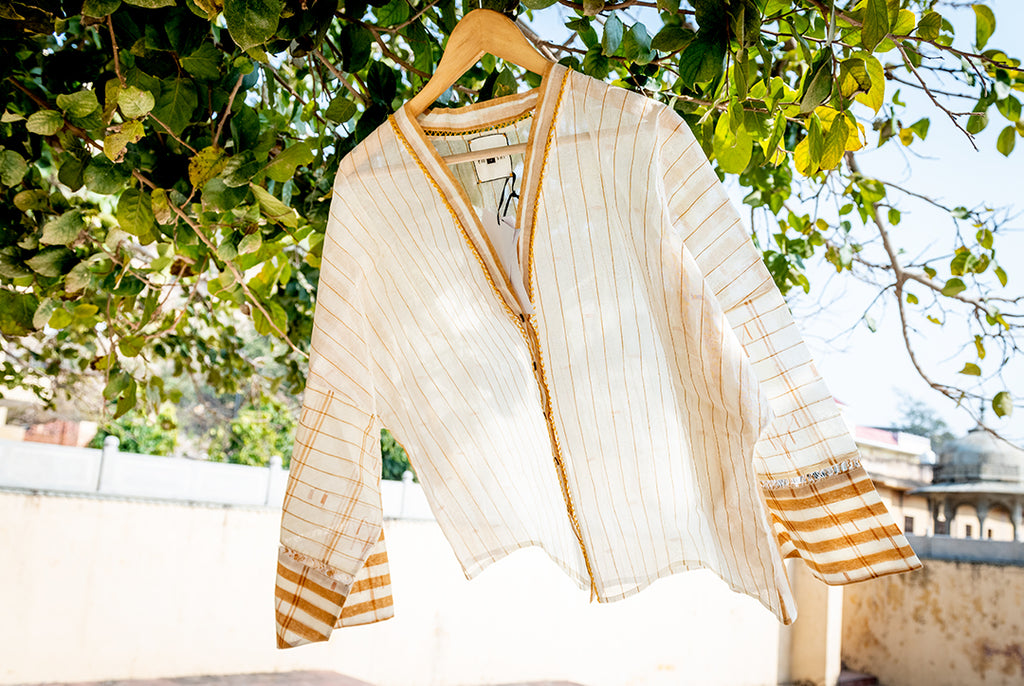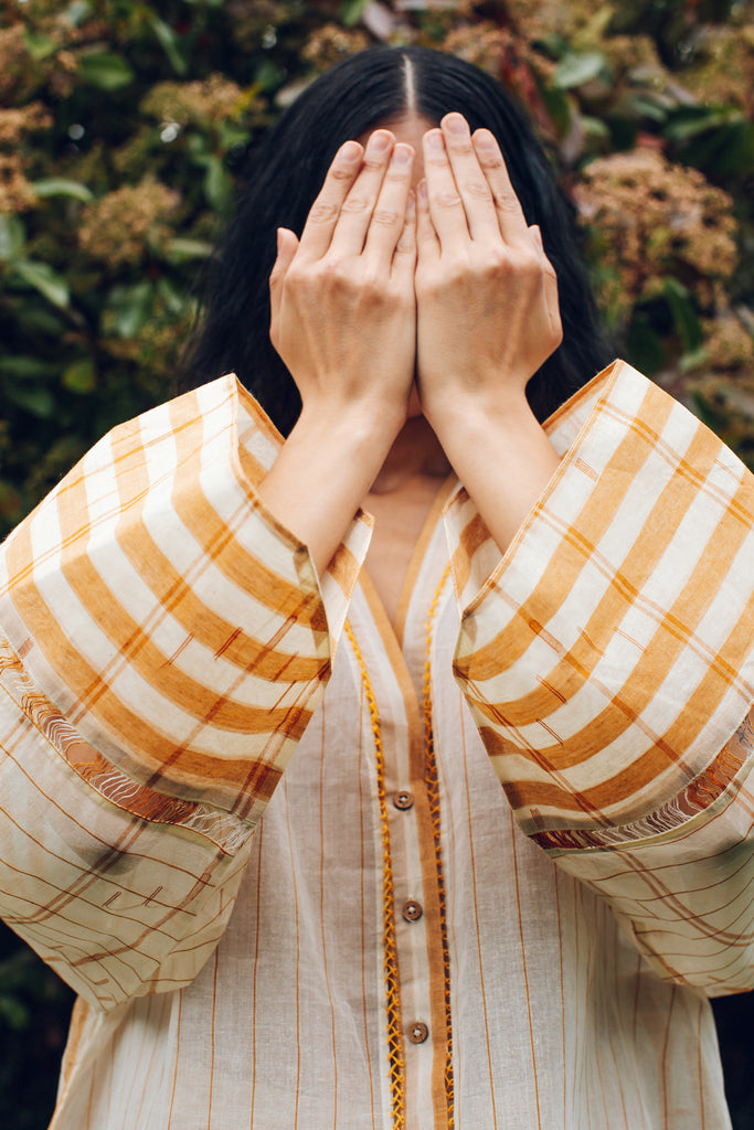 The caramel stripe yukata shirt is in hand-woven khadi, its an upcycled piece from a Khadi Saree.