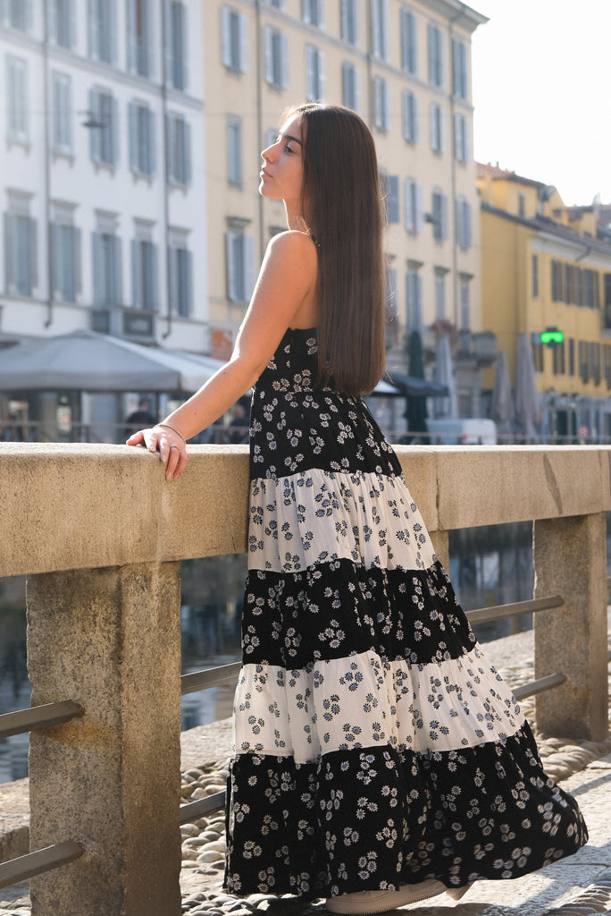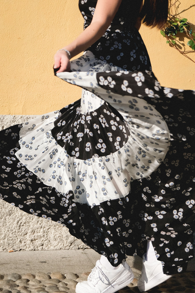 The alternate black and white panel elevate the look of this Monochrome Ditsy tiered dress. Broad straps and smocked back for utmost comfort while looking extra stylish is one of the many perks of this dress. The ultimate winning point of this dress is its volume and the fact that it has pockets. Pair with barely there sandals in the summer, or a cozy turtle neck in the fall season. Also looks great with a denim jacket.