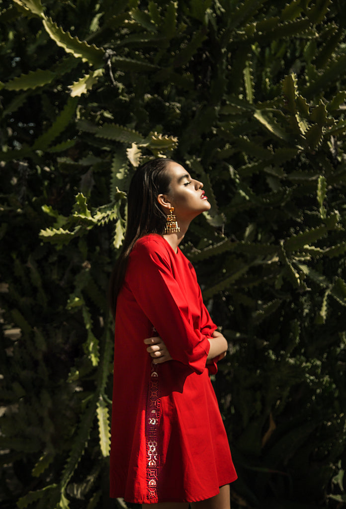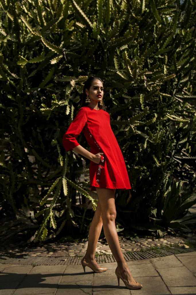 The ceremonial armour dress is intricately embroidered with motifs inspired by the Palace of Winds, Jaipur. It features pink, red and ombré sequins to create the depth in the artwork. With pocket on both sides, the dress is easy wear, glamorous & inspired.