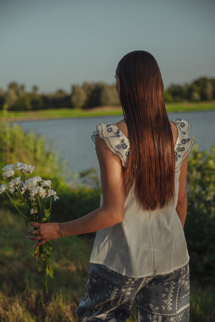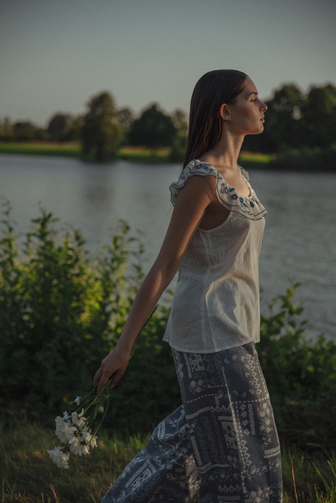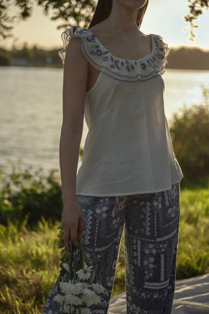 Neck in that is double frilled, embroidered with hand cut flowers, this piece is quintessentially us, handworked and yet so easy. Made in lightweight cotton, the cornflower frill top, brings elegance and comfort together. Can be paired with denims just as easily as its paired with our Ocean Patch print here.
