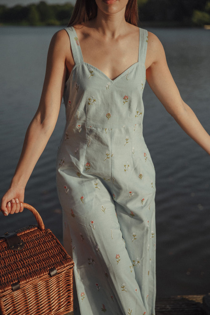 The ditsy floral embroidery bring a beautiful quaint quality to this jumpsuit. Its the perfect answer to ; what should I wear on a happy summer afternoon?'
