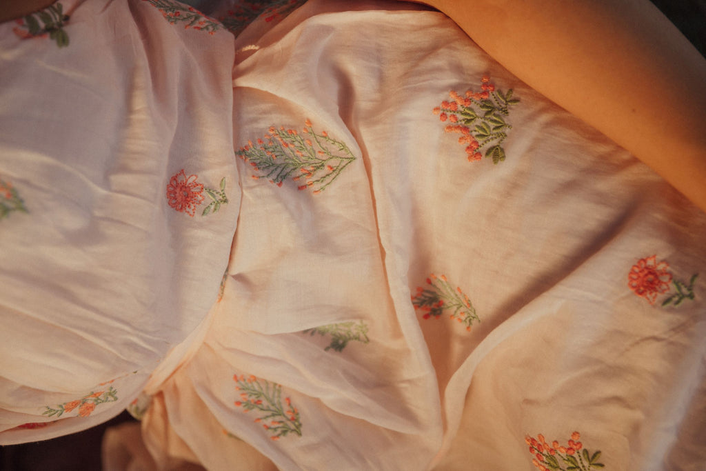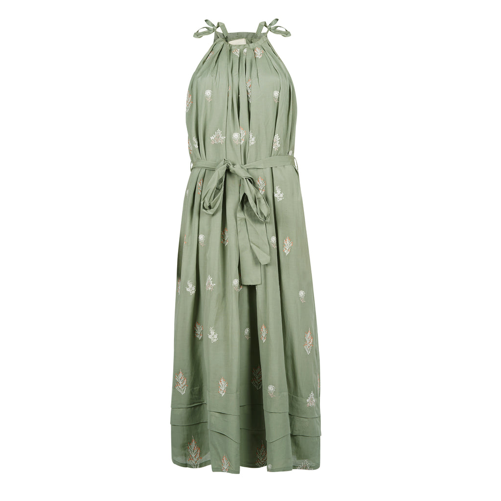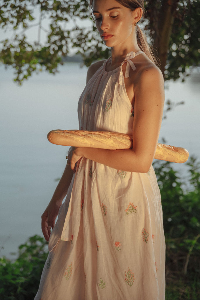 The delicate Shell Dress, with halter tie up, in shell pink colour, is a lovely midi length dress. Its embroidered with coral and floral motifs all over. The tie ups and the elegance of the embroidery bring a quaint feeling to this dress. Its chic and comfortable. This light weight, fuss free piece is sure to take you back to an English Rose garden.Â