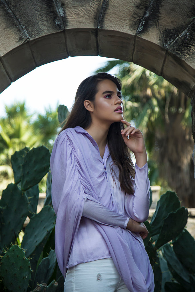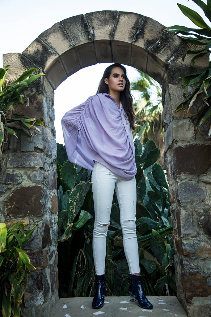 Old vs New Charm top is made in silk. The drape on one shoulder is set in silk georgette, and is finished in blended silk on the other. The buttons on this top is made of discarded sea shells. The sleeve under the drape is constructed like a shirt to provide ease in movement.