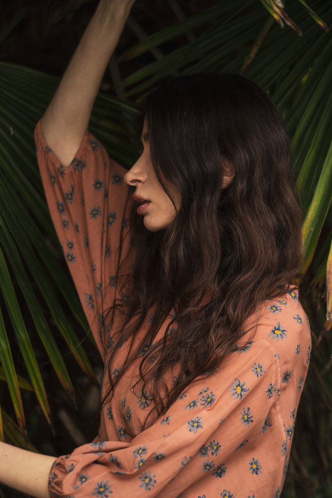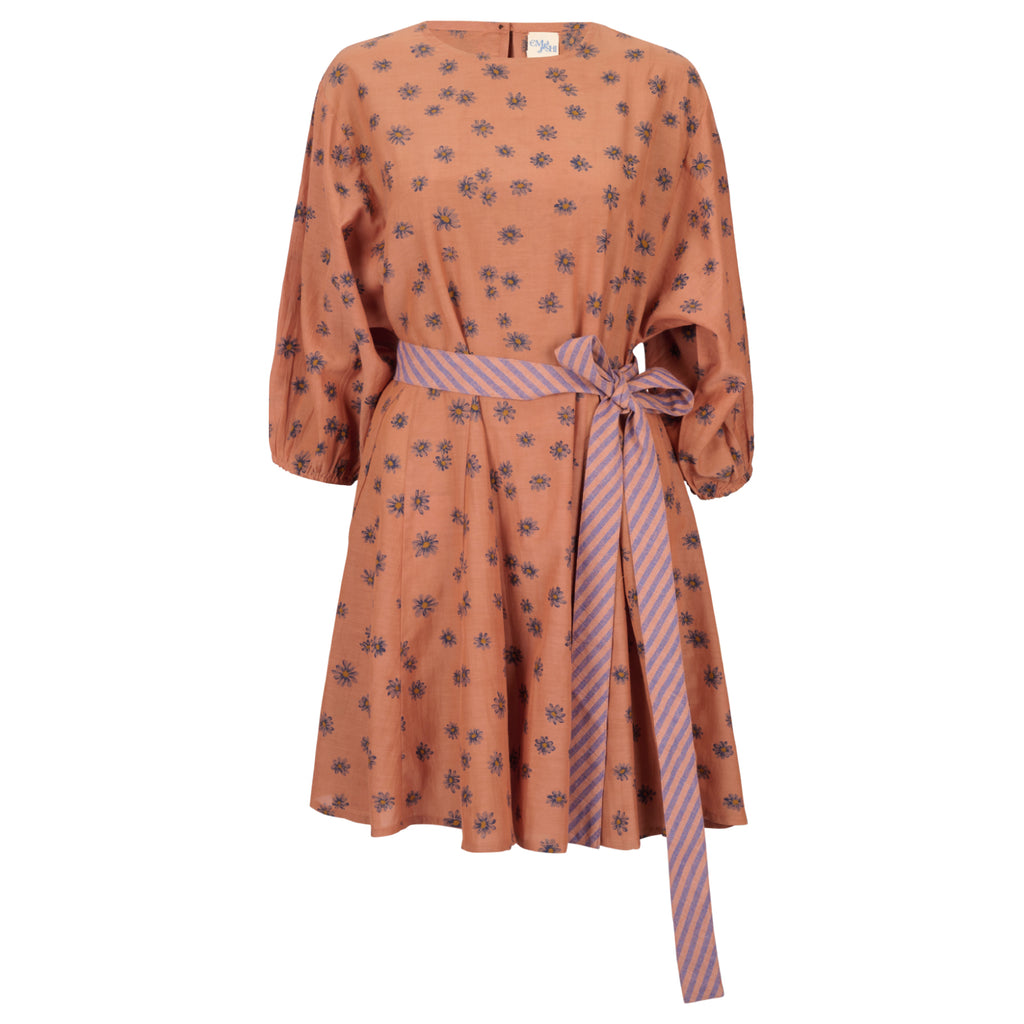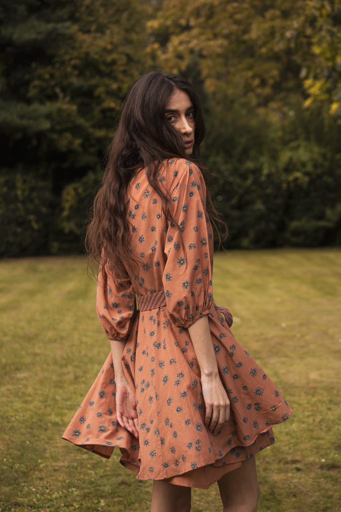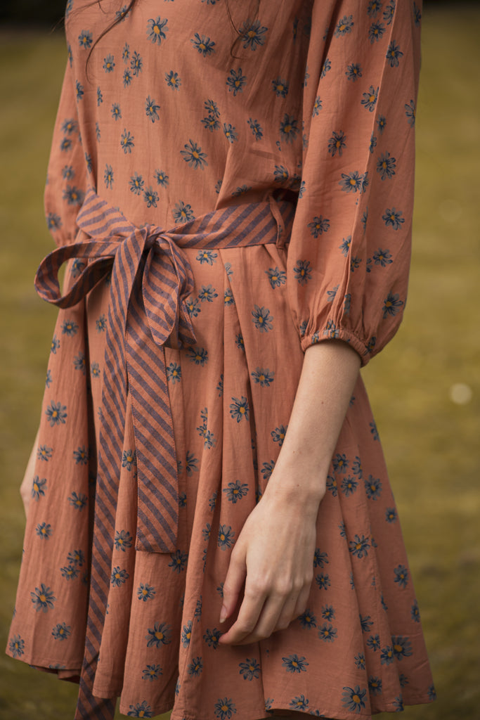 The Cinnamon Daisy Print captures the enduring charm of daisies set against the warm and earthy backdrop of cinnamon. The print evokes a feeling of rustic elegance, with daisies artfully scattered across the fabric, creating a harmonious blend of natural beauty and design.This mini dress has godet style construction, it flows beautifully. It comes with a bias stripe detachable belt which can be used to cinched waist. For carefree afternoons that turn into fun evenings, this dress can be worn to any event. Pair with high boots and cozy scarf for this fall season.Â