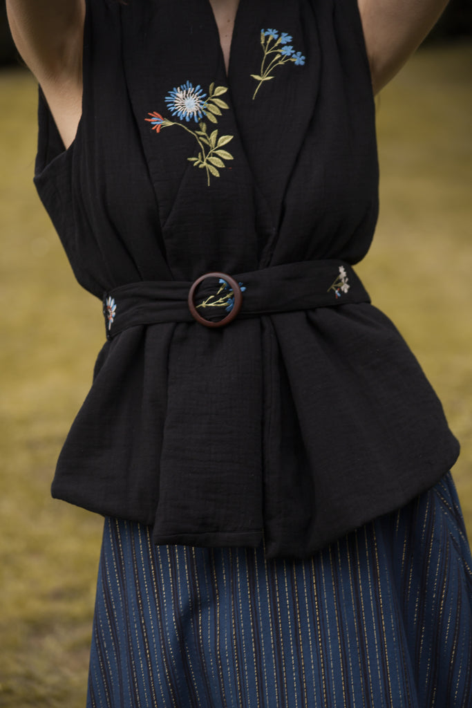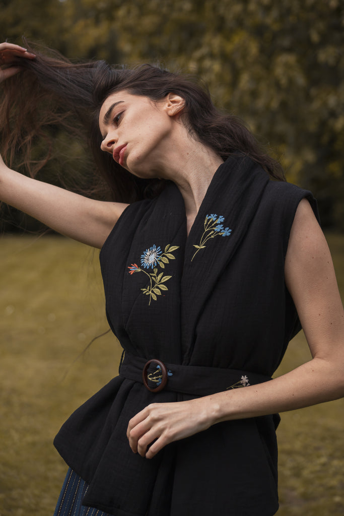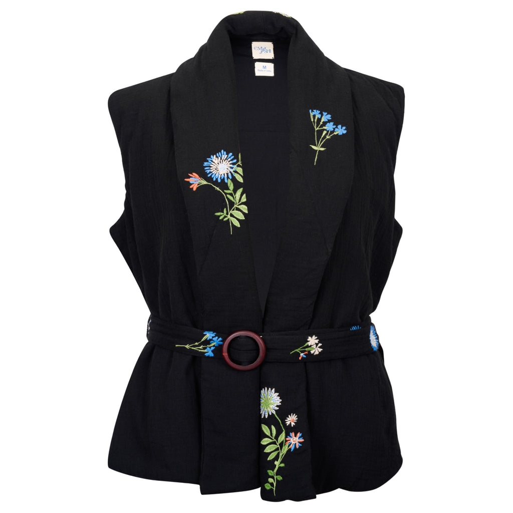 Introducing the Lily of the Valley Puff Jacket, a vest-style masterpiece that effortlessly combines fashion with function. Crafted to embrace comfort and style, this jacket features intricate floral embroidery scattered across its canvas and a cinchable belt to enhance your silhouette. The vest-style design is as stylish as it is versatile, allowing for easy layering and complementing a wide range of outfits, Pair with a puff sleeve shirt or over a cozy turtle neck.  The cinchable belt adds a touch of sophistication, giving you the freedom to customize your fit. Each bloom of intricate floral embroidery is a testament to careful craftsmanship, transforming your jacket into a work of art that exudes elegance. The Lily of the Valley Puff Jacket is a versatile, timeless choice for elevating your style, whether you're heading to an outdoor gathering, a leisurely stroll, or a cozy evening out.