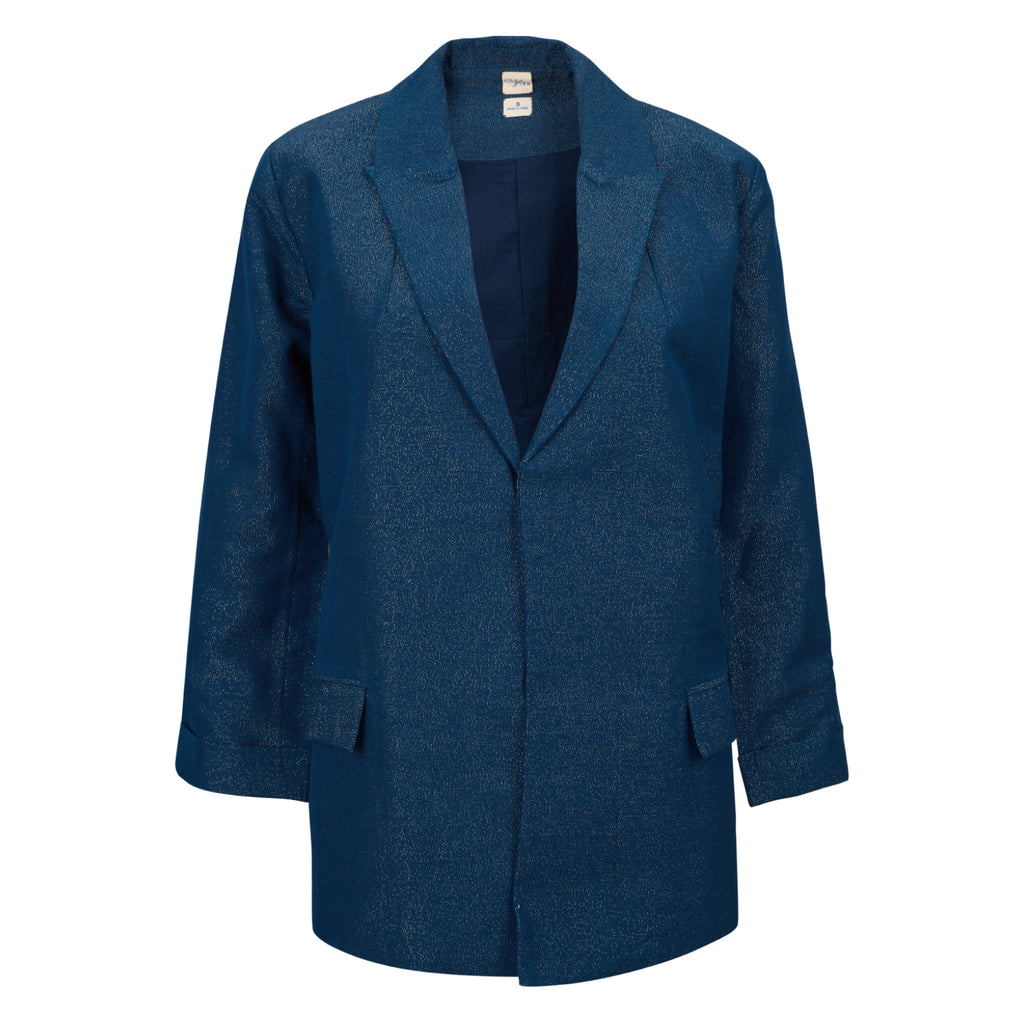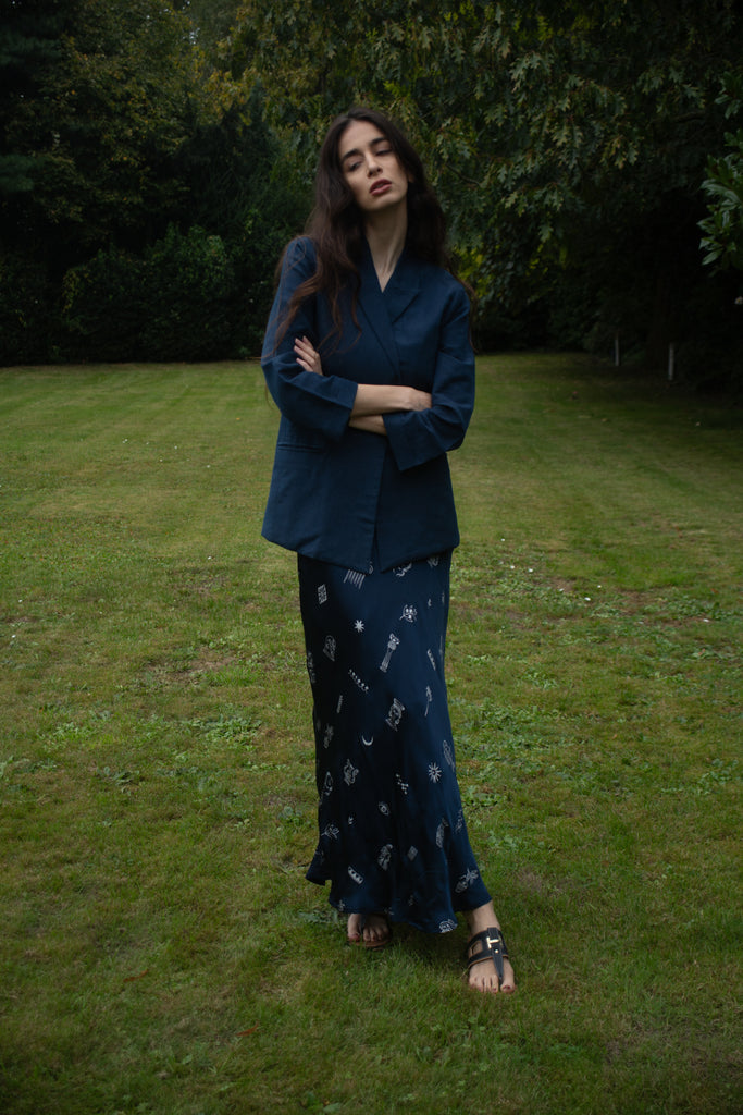 The blazer, with its sharp lines and impeccable cut, complements the fluidity of the slip dress perfectly. Crafted from a luxurious linen blend fabric, it provides an ideal contrast to the dress's midnight blue hue.The Olympia Blazer features classic notched lapels, and three-quarter sleeves, adding a sense of refinement to your outfit. Wear it open for a relaxed, effortless look, or buttoned up for a more structured and powerful appearance. Its a great standalone piece but together, the Midnight Blue Silver Lining Slip Dress and Olympia Blazer create an ensemble that effortlessly transitions from daytime meetings to evening events. Whether you're attending a business function or celebrating a special occasion, this combination offers a silver lining to any wardrobe, ensuring you stand out with style and grace.Â