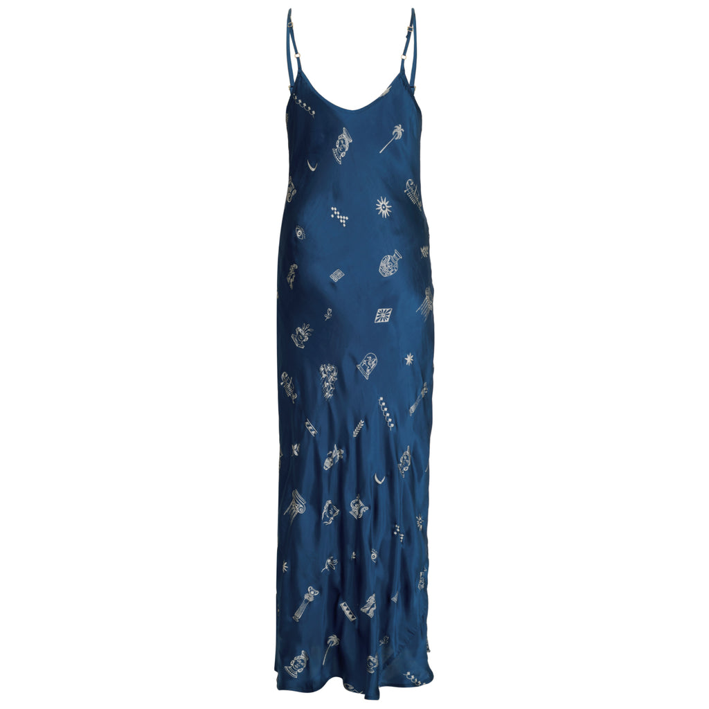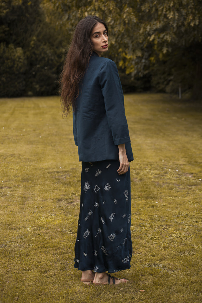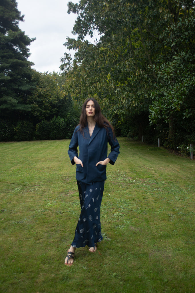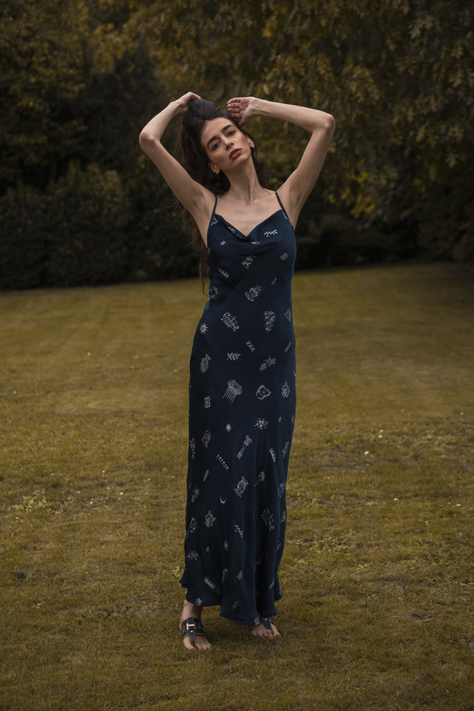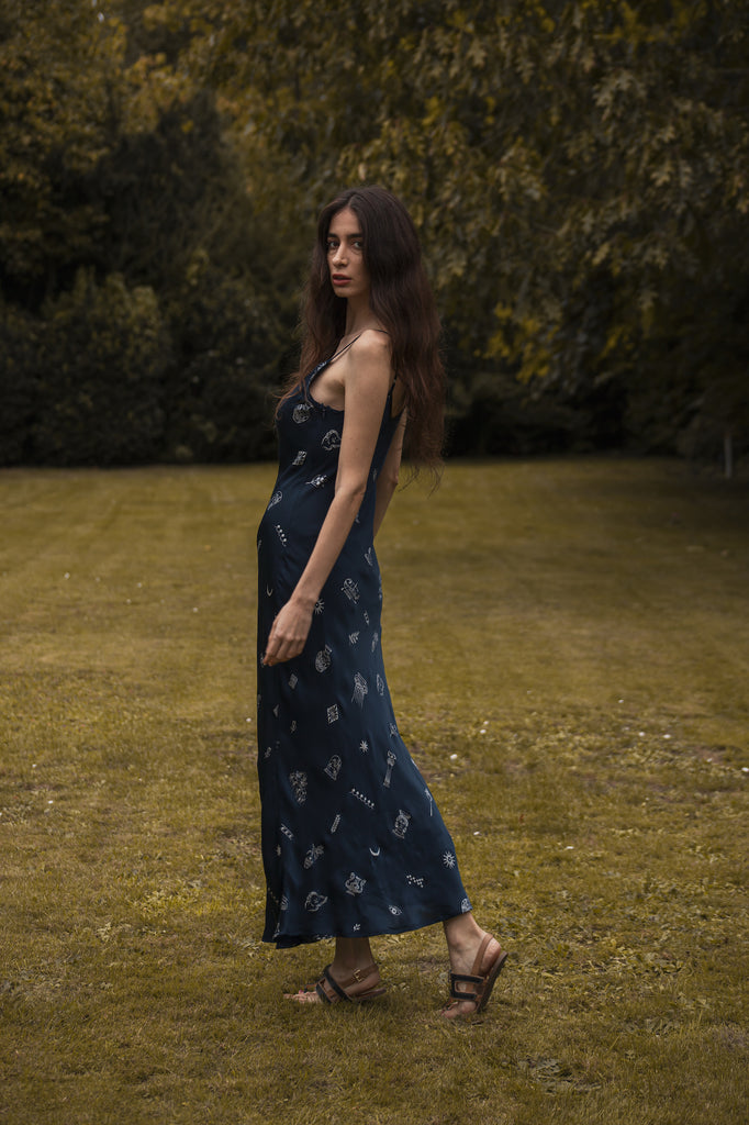 The Midnight Blue Silver Lining Slip Dress boasts a minimalist yet captivating design. Crafted from a rich midnight blue fabric, it resembles the tranquil night sky, evoking a sense of serenity and grace. The dress features a gently scooped neckline and delicate spaghetti straps that gracefully frame your shoulders. Its ankle-grazing length adds an air of graceful movement with every step you take.The subtle A-line silhouette of the dress flatters a variety of body types, and its bias-cut fabric drapes beautifully, hugging your curves in all the right places.Â