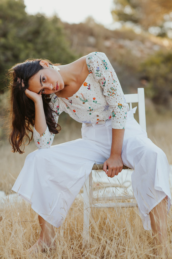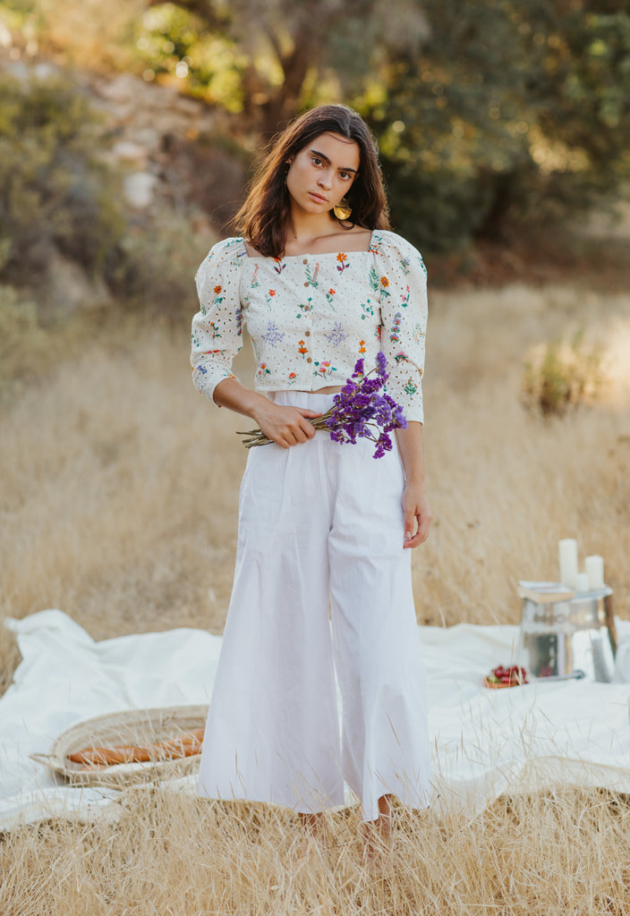The White bucket pants are an essential part of any wardrobe, pair it with any crop top and you have your look there. These pants are half lined with light weight cotton. So goodbye to the woe of white pants. Paired here with Summer Herbs Top.