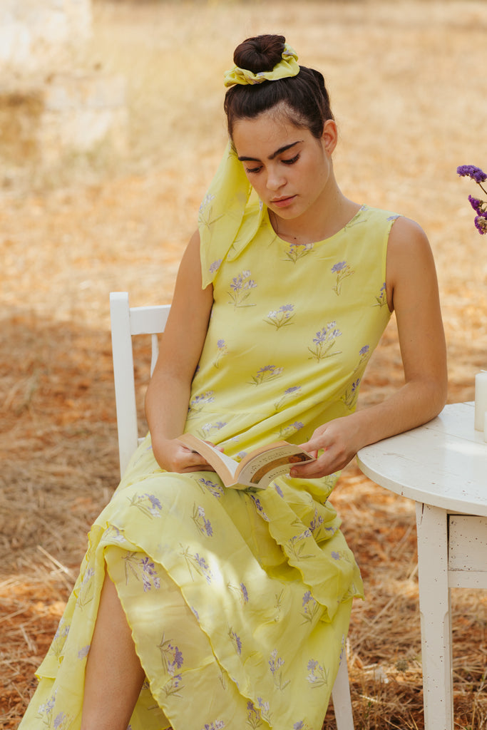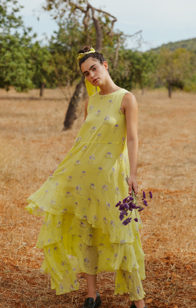 This dress is light as a feather and multi-tiered, so comfortable and so flowy. The fabric for this dress is up cycled and over printed with our Love Lemon Lavender Print, it's a limited edition piece. A great pick for yummy colours and goddess vibes.