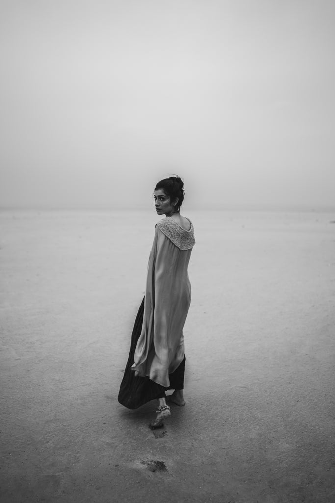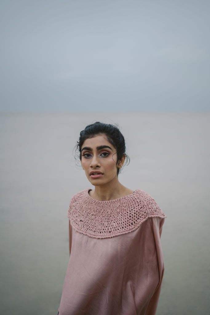 The yoke of the Ephemeris cape is hand knotted by hand. It takes an artisan 29 hours to individually cut the strips and hand knot them into the neck yoke. It is made in a fibre generated from cotton, which is biodegradable. The cape is proportionally longer at the back. It is styled here with a pleated dress.