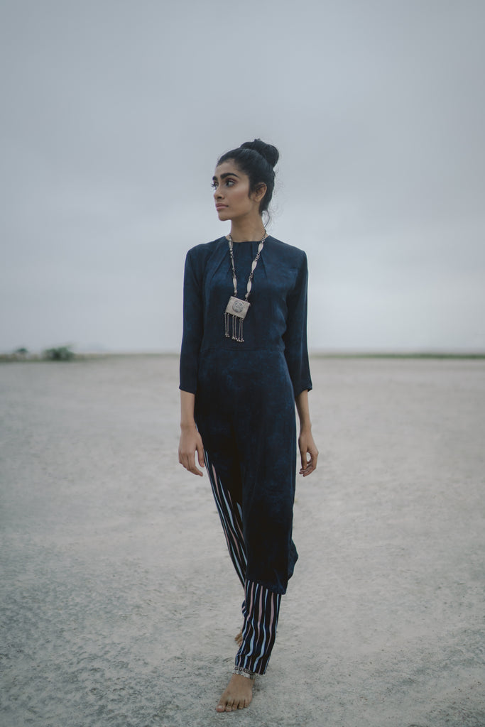 The half moon tunic is made in fabric that is regenerated from cotton. The tunic has pleat detail on the neck, and fastened at the back. It is paired here with pants in hand-drawn stripes.