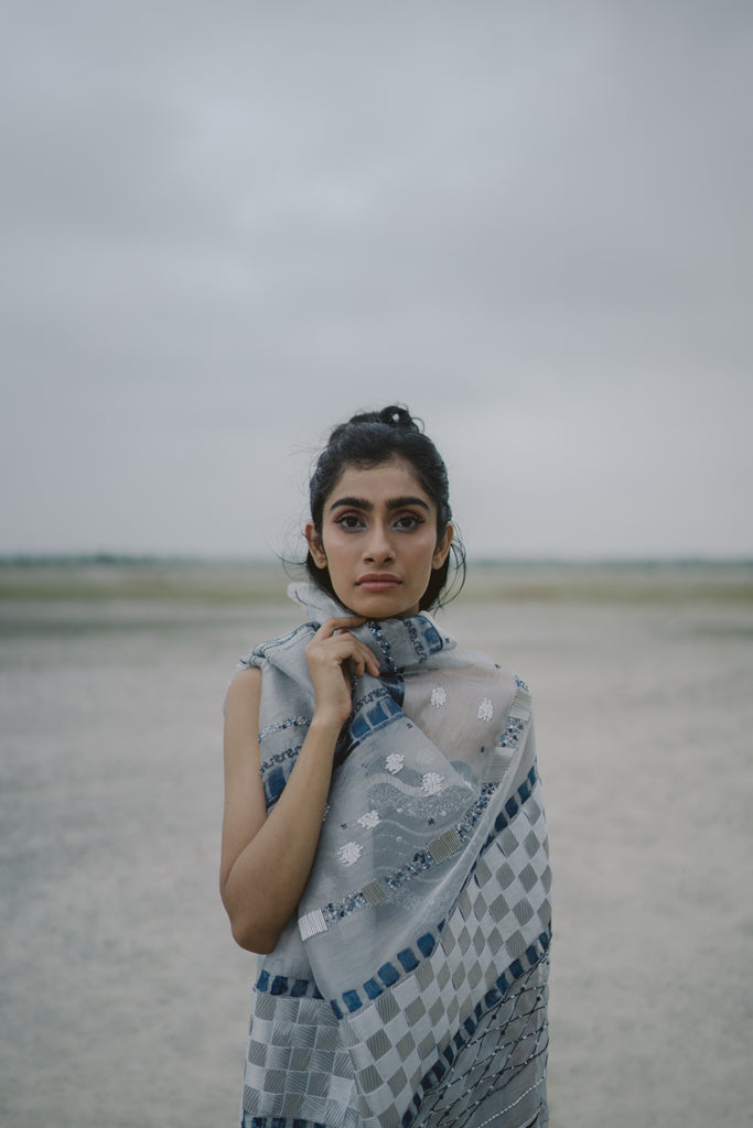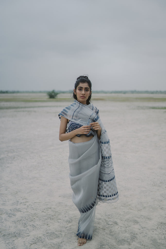 Moonrise sari is made in silk tissue. It is embellished with midnight blue and pearl sequins. It has chatai handwork on the shoulder drape. This sari is hand-painted in midnight blue. It requires 55 artisan hours to complete this piece.