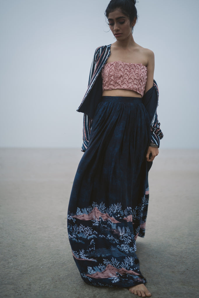 This handmade piece is styled here with Dark Side of the Moon jacket and Equator Skirt.