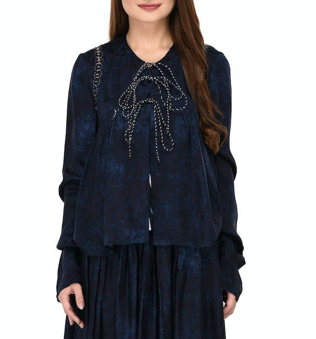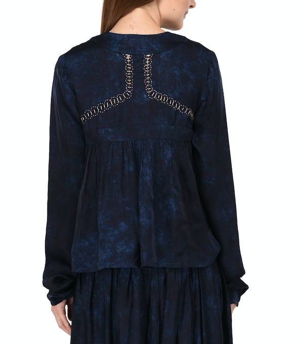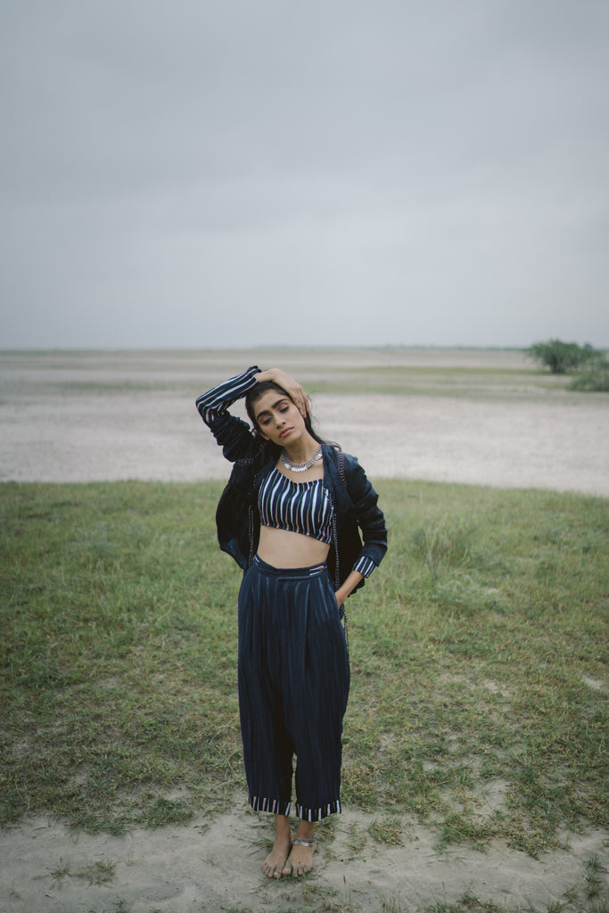 A modern take on traditional jacket worn by men in Gujarat. The piece has Kantha work detail on the bodice and back. The gol dori is intertwined with silver thread to give it dimension. The details are incorporated in 25 artisan hours. Made in fibre regenerated from cotton.This jacket is paired here with Théo pants and rectangular top.